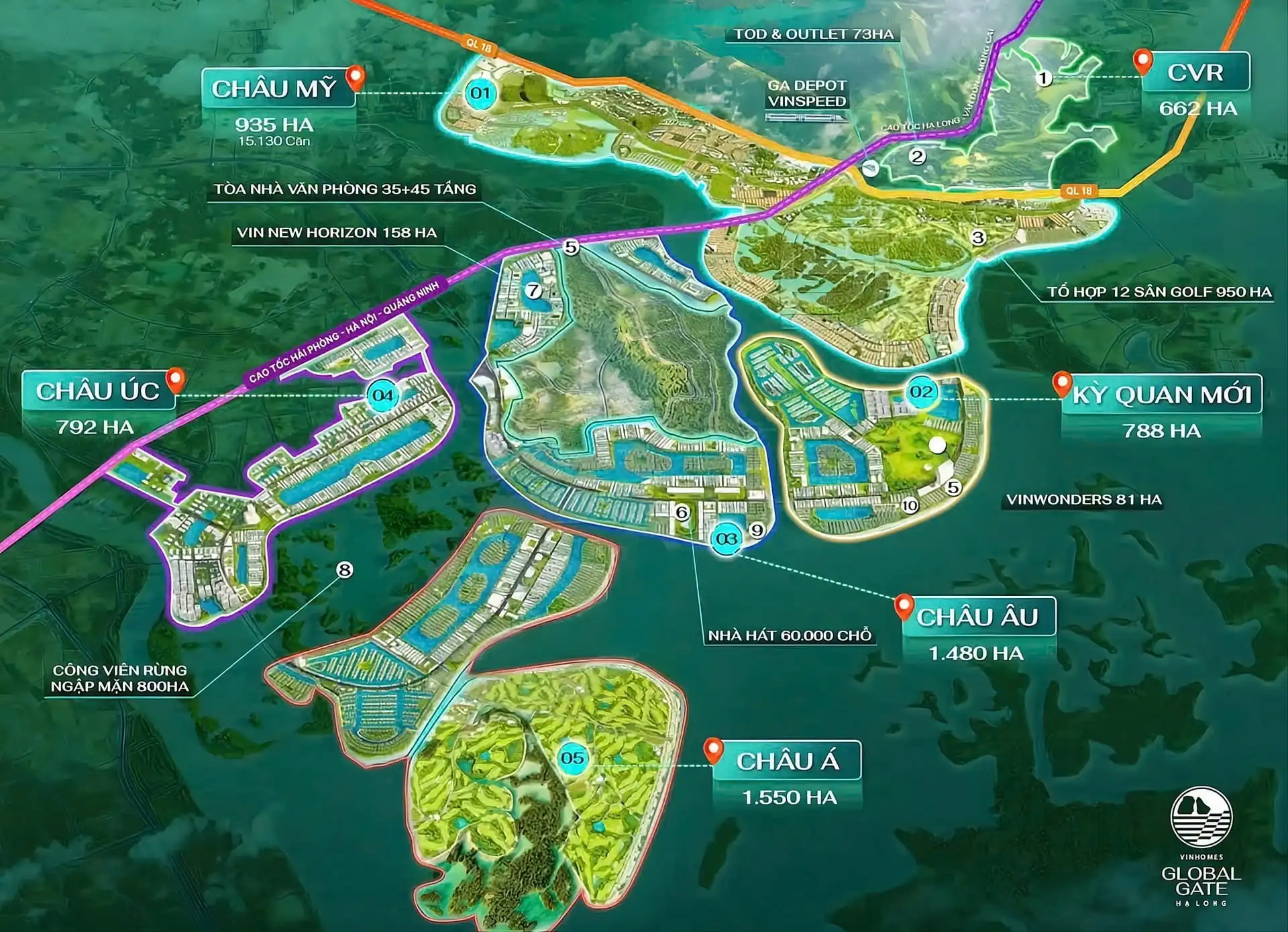 Toàn bộ quy hoạch khu đô thị Hạ Long tại Vinhomes Global Gate được chia thành 6 phân khu lớn, mỗi phân khu một phong cách kiến trúc và nhóm sản phẩm riêng.