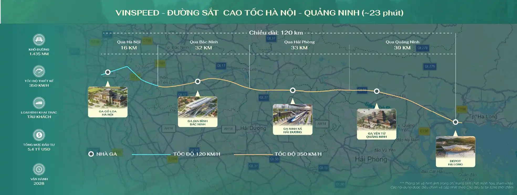 Tuyến đường sắt tốc độ cao VinSpeed đang trong lộ trình triển khai, dự kiến vận hành thương mại quý 4/2028. Khi hoàn thành, ga Cổ Loa (Đông Anh, Hà Nội) kết nối thẳng về Vinhomes Hạ Long Xanh trong 23 đến 30 phút, tốc độ thiết kế 350 km/h.